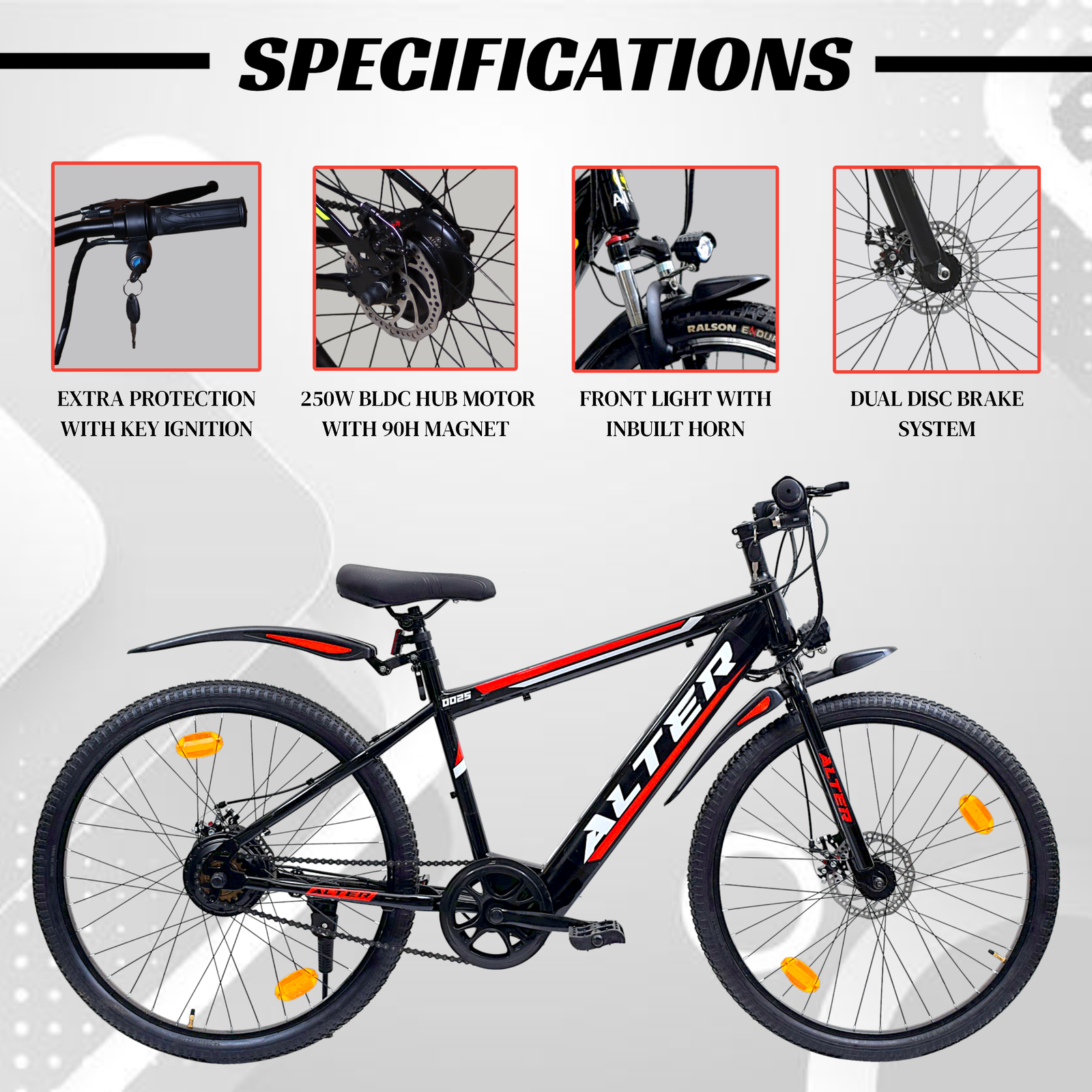 Alter 26″ 002S Model Electric Cycle with 36V 250W BLDC HUB Motor | LI-ION BATTERY | 95% PREASSEMBLED with Charger